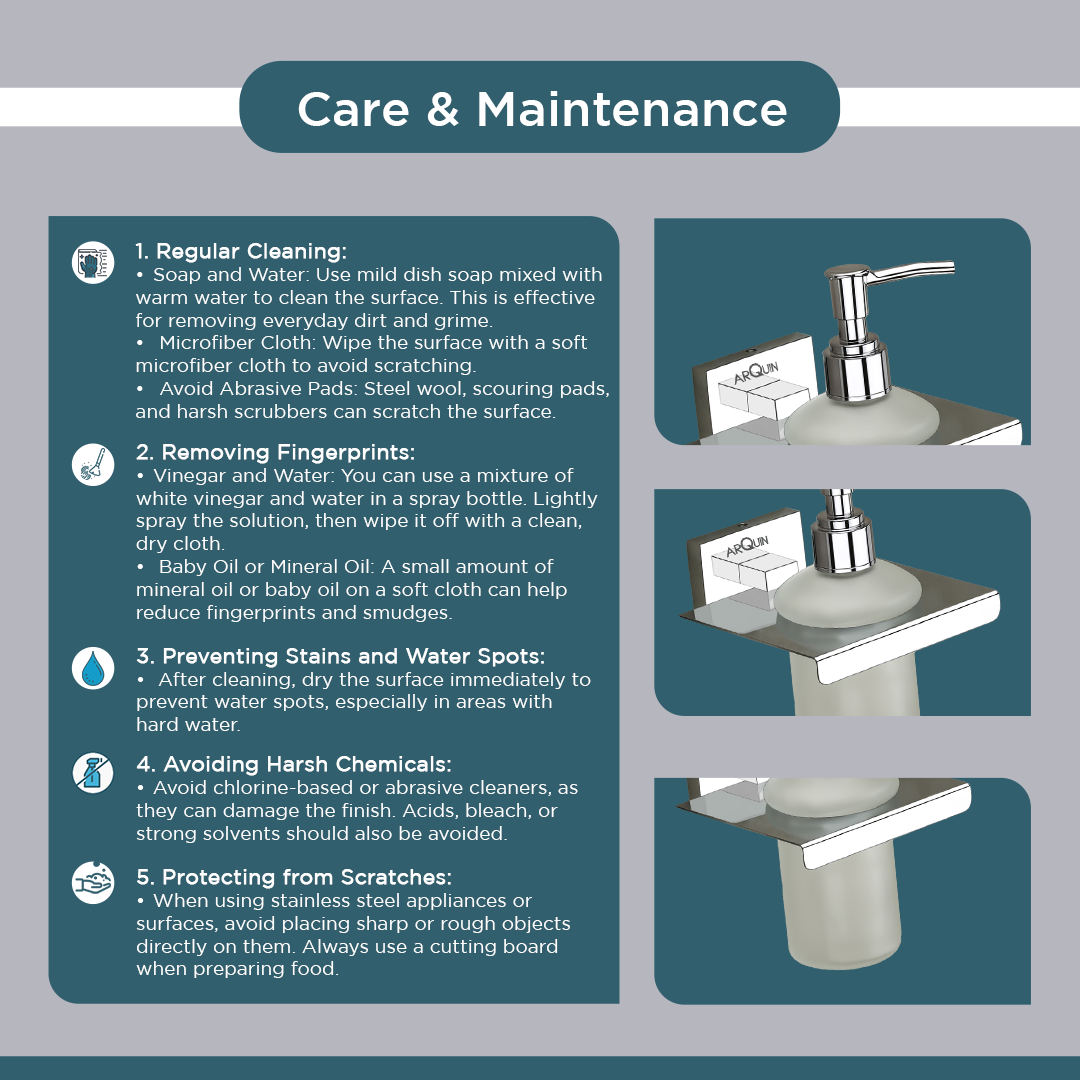 Product Description - The ARQUIN 304 Grade Stainless Steel Liquid Soap Dispenser is a sleek and durable bathroom accessory designed to offer convenience and style.