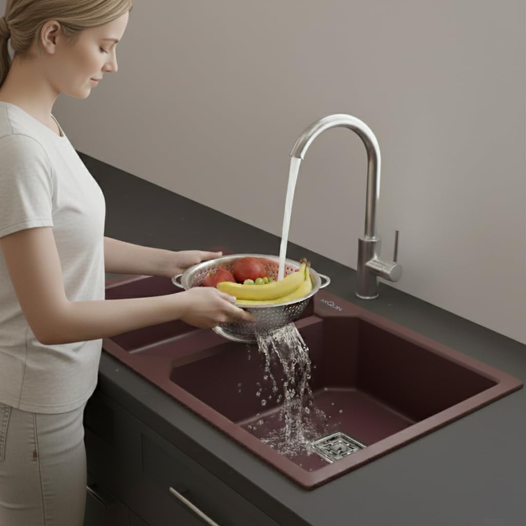 • Dense quartz build absorbs sound, minimizing water & utensil noise.