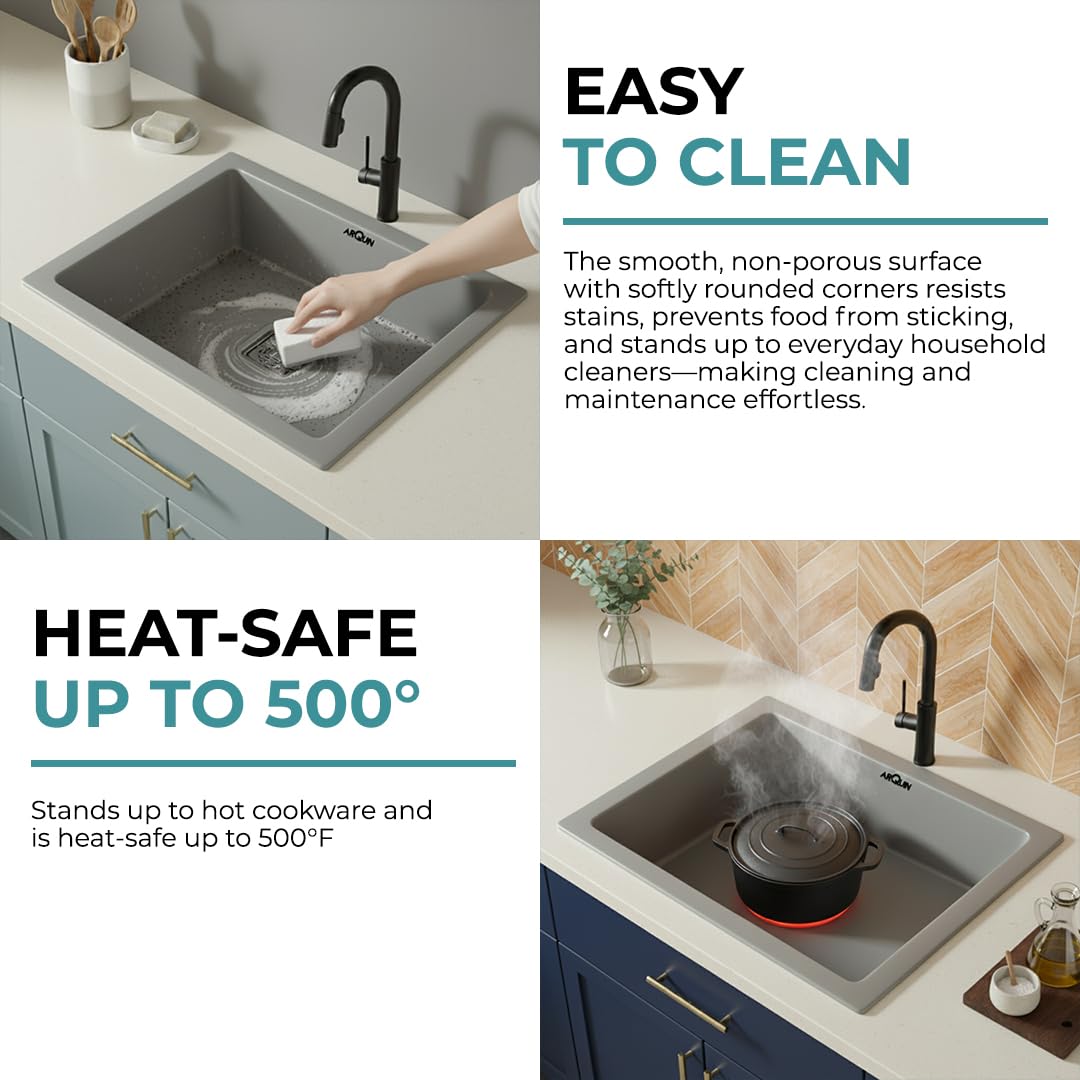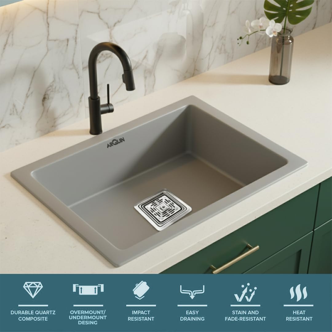 ARQUIN Quartz Kitchen Sinks are crafted from premium quartz granite, ensuring exceptional strength and durability. The surface offers superior scratch resistance and is finished with a refined white coating for a timeless, elegant appearance. Please note that the tone or shade of the quartz may vary slightly due to batch manufacturing and lighting conditions.