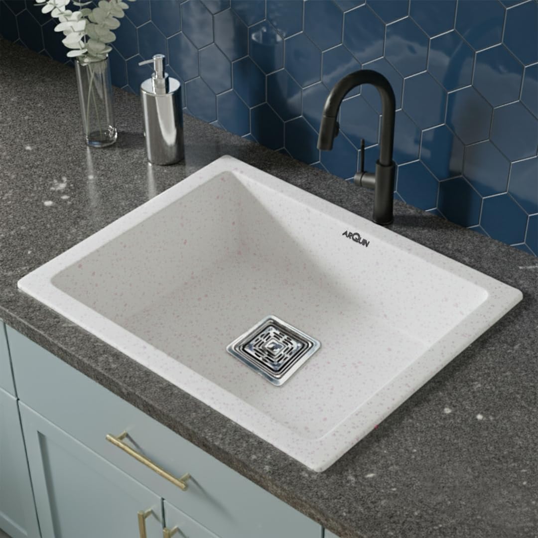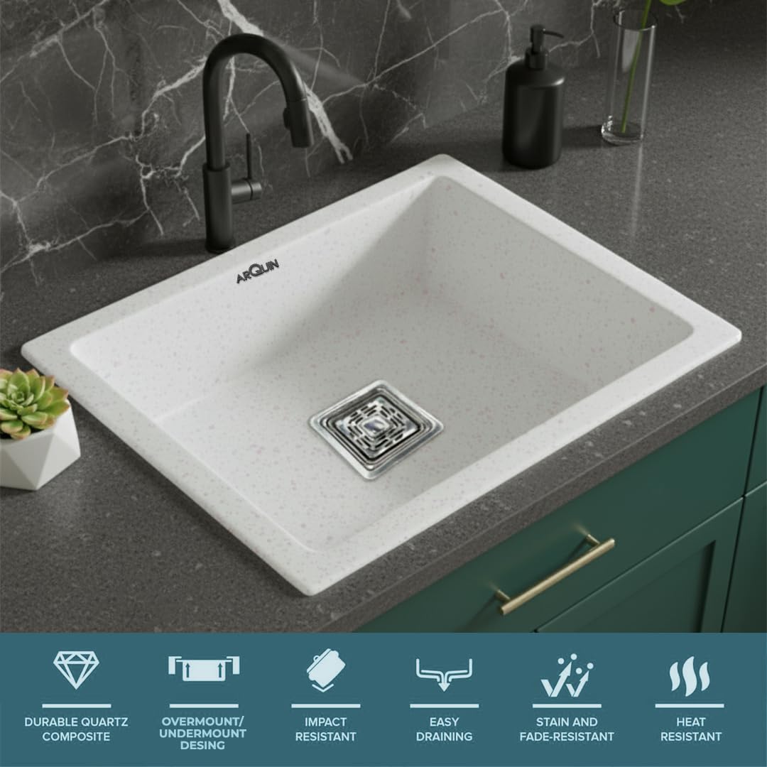 ARQUIN Quartz Kitchen Sinks are crafted from premium quartz granite, ensuring exceptional strength and durability. The surface offers superior scratch resistance and is finished with a refined white coating for a timeless, elegant appearance. Please note that the tone or shade of the quartz may vary slightly due to batch manufacturing and lighting conditions.