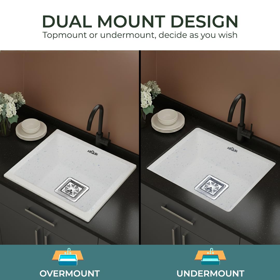 ARQUIN Quartz Kitchen Sinks are crafted from premium quartz granite, ensuring exceptional strength and durability. The surface offers superior scratch resistance and is finished with a refined white coating for a timeless, elegant appearance. Please note that the tone or shade of the quartz may vary slightly due to batch manufacturing and lighting conditions.