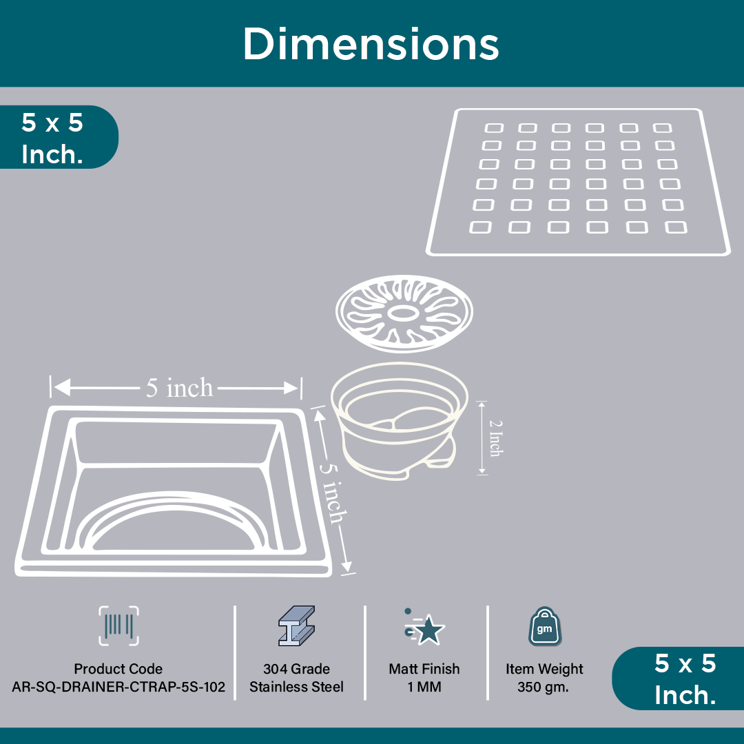 Product Description - The ARQUIN 304 Grade Stainless Steel Square Floor Drainer with Cockroach Trap (5x5 inch) is a high-quality, durable drainage solution designed to provide efficient water drainage while preventing unwanted pests. Made from premium 304-grade stainless steel, this floor drainer offers superior resistance to corrosion, rust, and wear, ensuring it remains reliable and functional for years.
