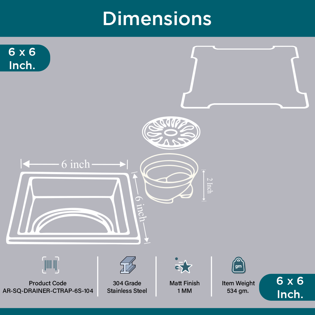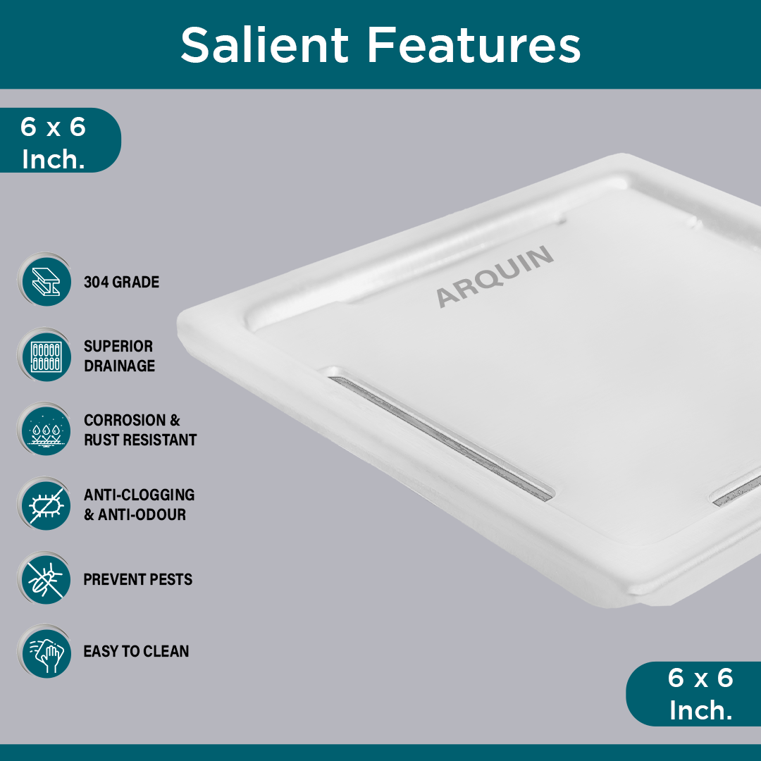 Product Description - The ARQUIN 304 Grade Stainless Steel Square Floor Drainer with Cockroach Trap (6x6 inch) is a high-quality, durable drainage solution designed to provide efficient water drainage while preventing unwanted pests. Made from premium 304-grade stainless steel, this floor drainer offers superior corrosion, rust, and wear resistance, ensuring it remains reliable and functional for years.