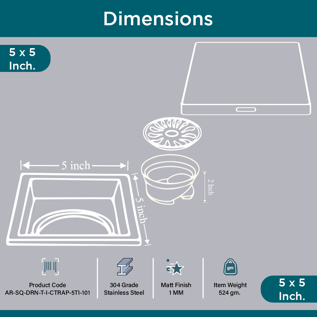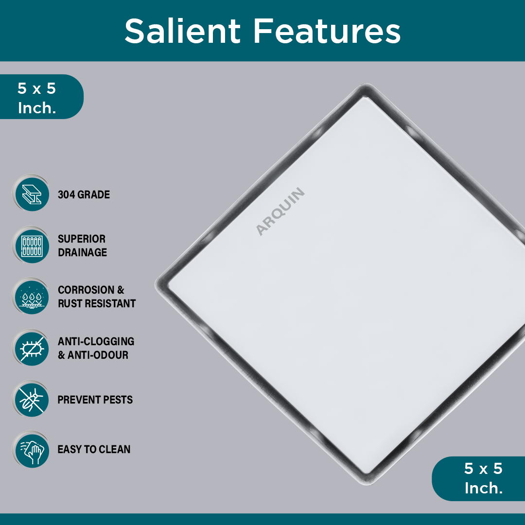 Product Description - The ARQUIN 304 Grade Stainless Steel Square Tile Insert Floor Drainer with Cockroach Trap (5x5 inch) is a top-tier drainage solution designed for modern spaces. Constructed from premium 304-grade stainless steel, this floor drainer offers outstanding durability, corrosion resistance, and a sleek appearance.