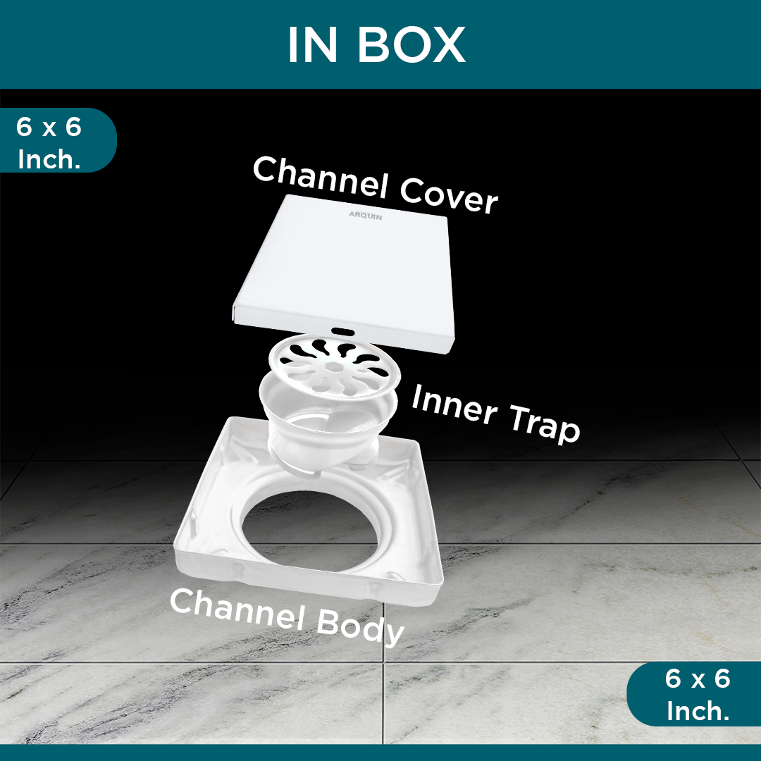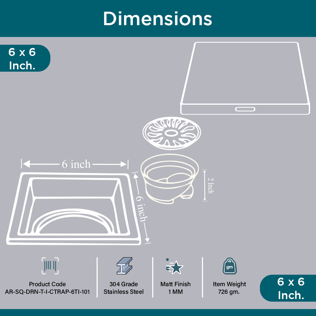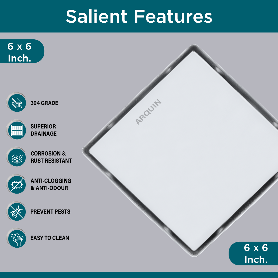 Product Description - The ARQUIN 304 Grade Stainless Steel Square Tile Insert Floor Drainer with Cockroach Trap (6x6 inch) is a top-tier drainage solution designed for modern spaces. Constructed from premium 304-grade stainless steel, this floor drainer offers outstanding durability, corrosion resistance, and a sleek appearance.